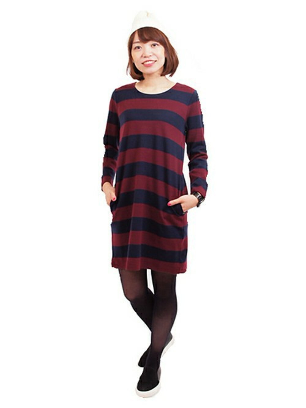 シンプルなボーダーワンピースもボルドーを挟んだカラーをチョイスしてあたたかみのある装いに。 BIGボーダーでカジュアルさをアピールしつつ、そのカラーとハリのある素材感で大人かわいいラインを実現しました。 ポケット口にチラリと覗くカラーステッチも効果的☆