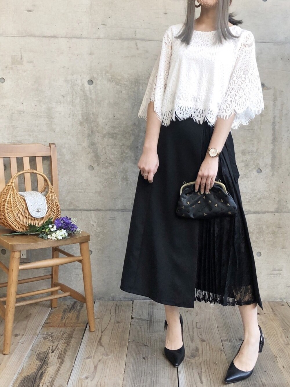 ten⭐︎ichiko のスカート「ポイントレースプリーツ切り替えスカート」を使ったコーディネート