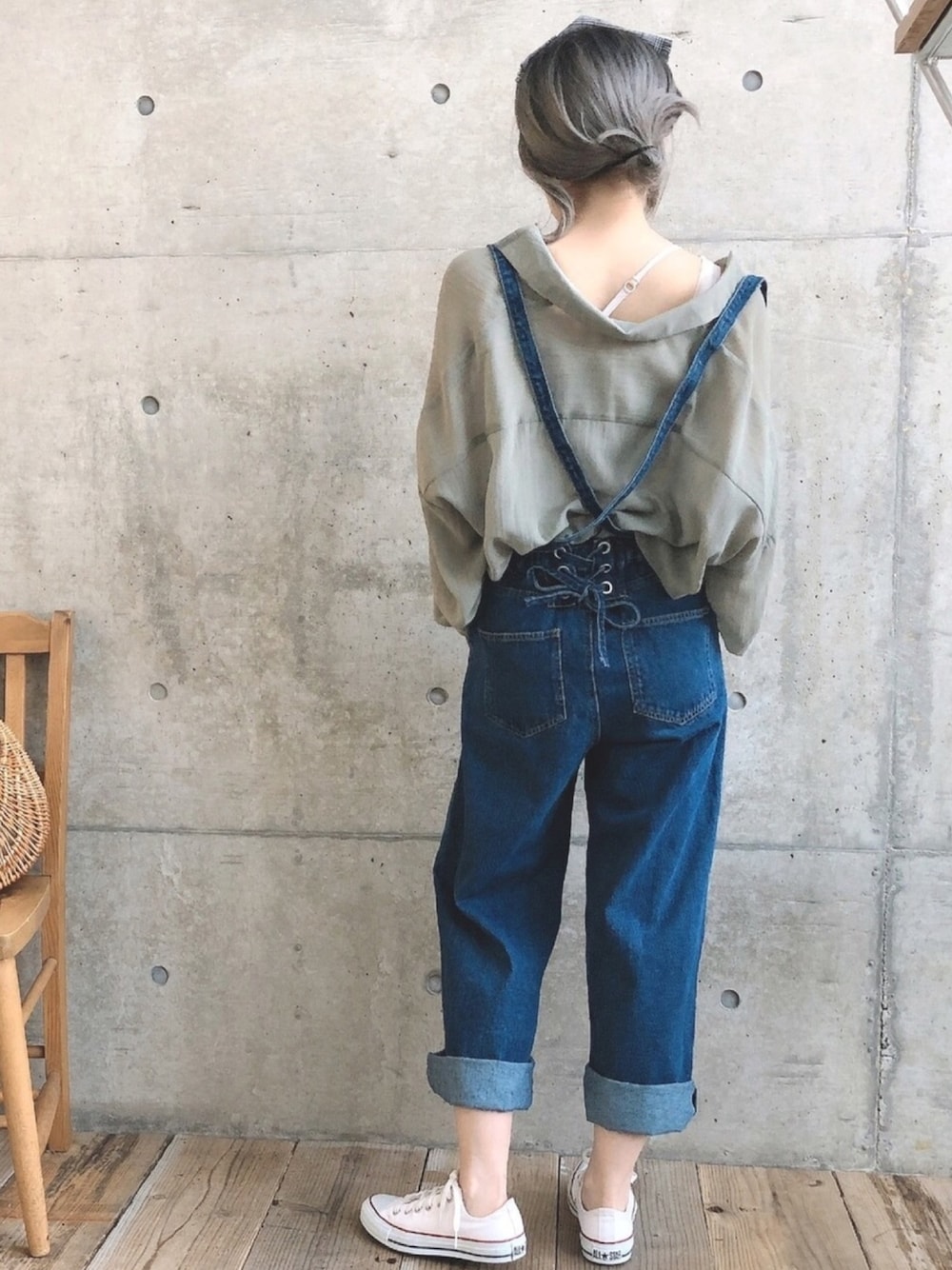 朝あげたコーデの後ろ姿バージョン! アイテムがガーリーだったら、 中の人に色気がなくても可愛くなるんですコーデ。 レースアップデニムちゃんのおかげで男前な後ろ姿が緩和されてルー😂 シアーシャツは羽織にも使えて超絶便利♡