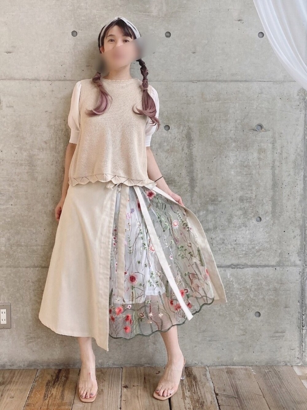 巻きスカートがあまりに可愛いので着回しが捗ります♡ プリーツスカート重ねても可愛いけど、私だったら刺繍スカートチラッとさせたい🥰 柄物は着回ししにくいけど、ペチコートみたいにチラ見せすると新鮮じゃない? 使いやすいからこの夏大活躍の予感♡