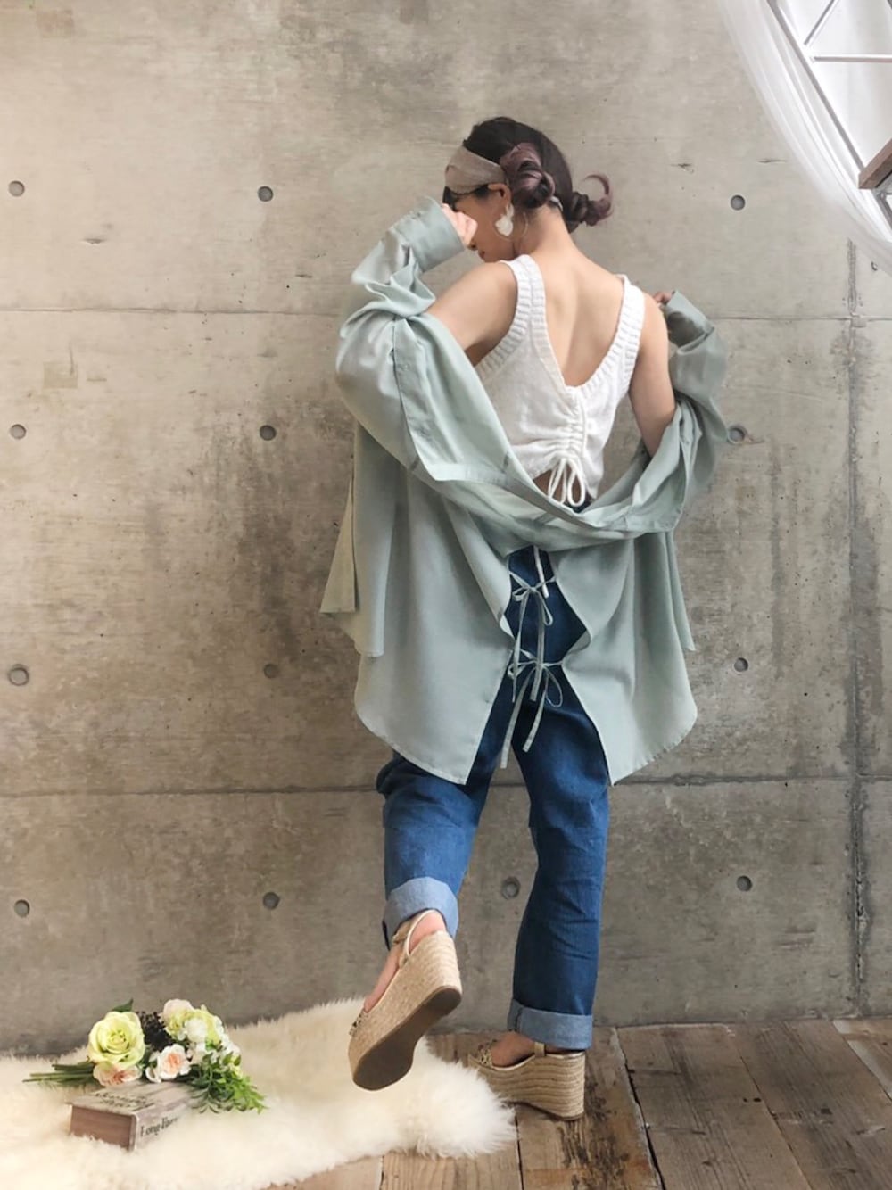 大人気のニットビスチェ、インナーにしても可愛いのです♡ バックシャンな後ろリボンシャツに合わせると背中チラリしちゃいます♫ ほんのり見える感じが好き🥰