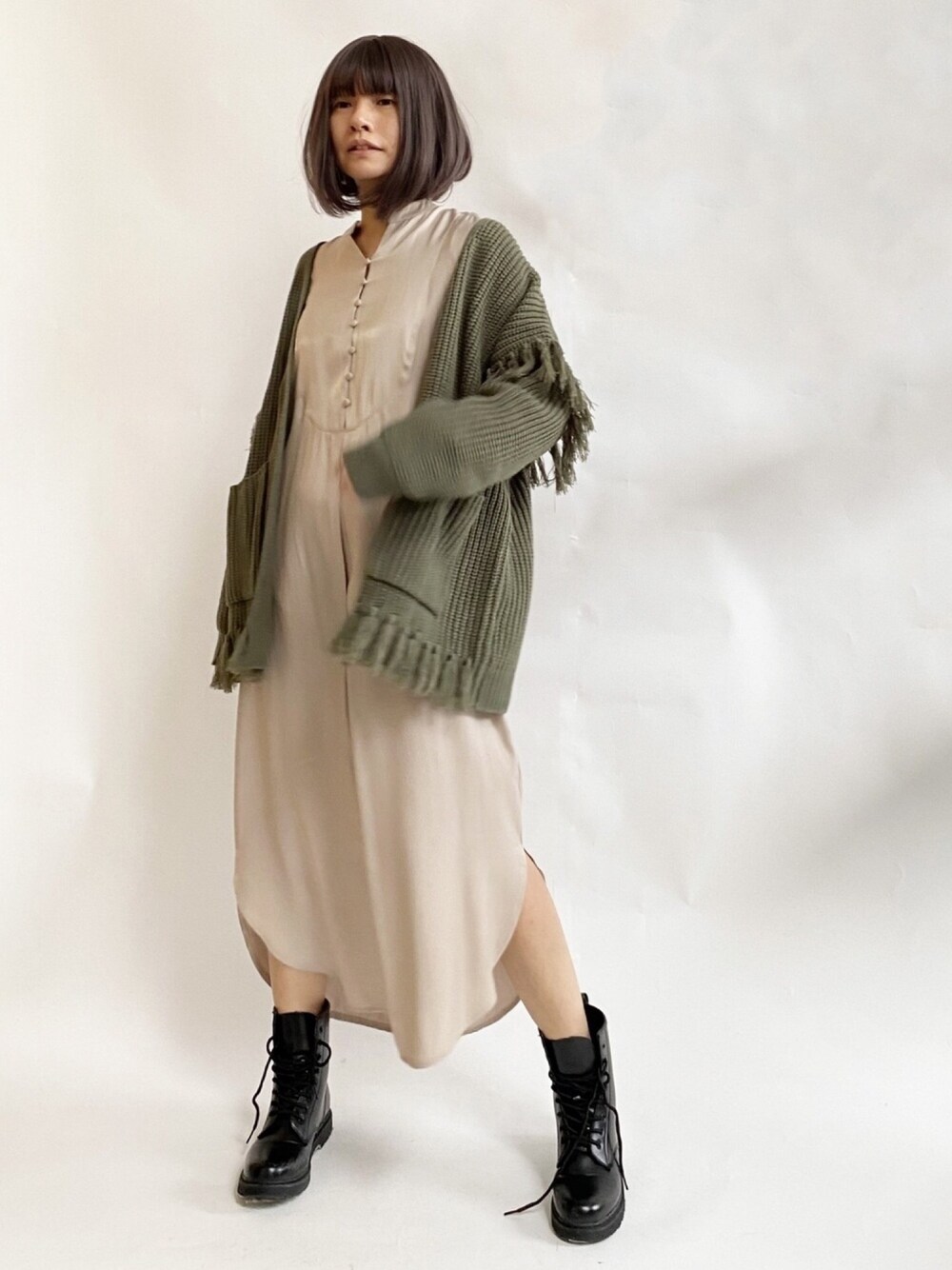 チャイナ香るシャツワンピは絶妙可愛い光沢感がツボ♡ 伝わるかなー🥰 こないだヨーダコーデしたフリンジカーディガン、じつはちゃんと可愛いんです。 使いやすい三色展開だよ♡