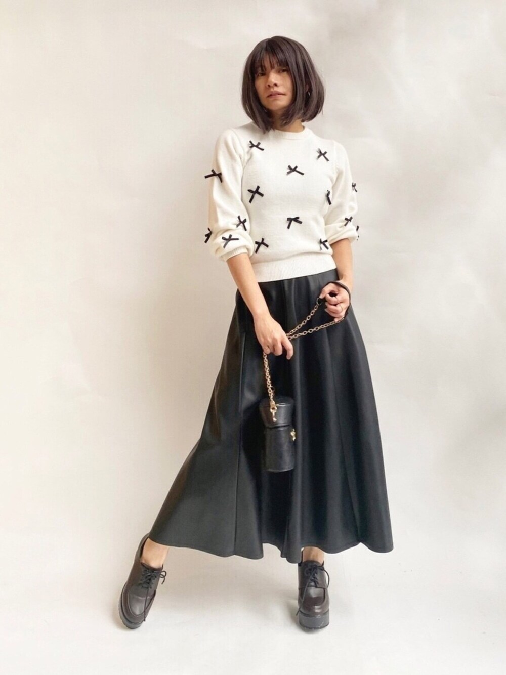 リボンいっぱい♡ コンパクトニットはサラッと使えて良き良き! レザースカートでキリッと引き締めて大人キュートなコーデはいかがでしょー???