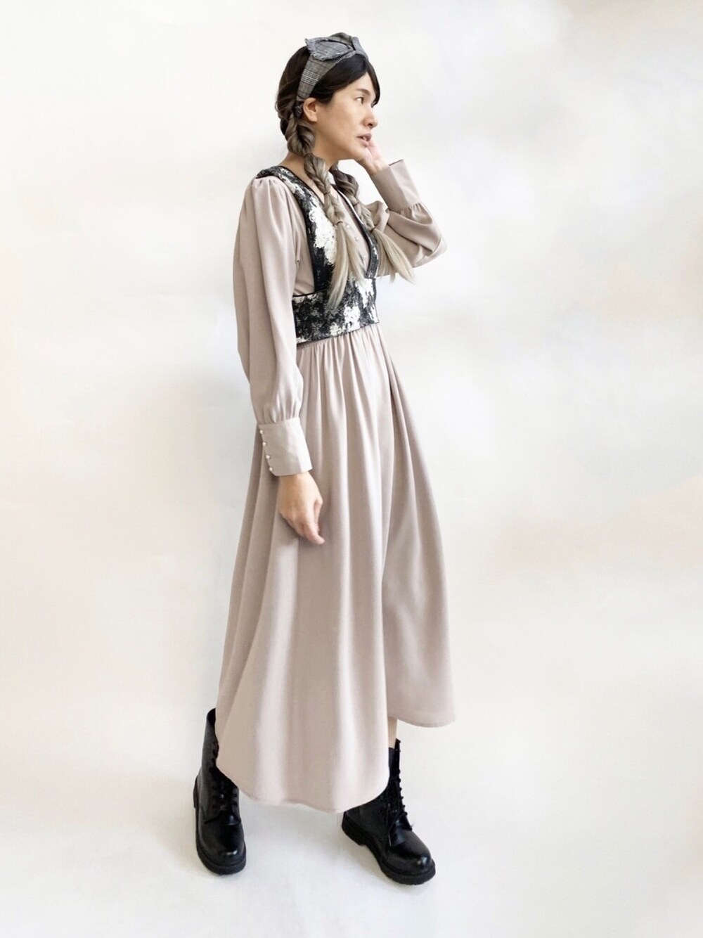 このワンピース、スタイルアップしすぎなのですが。 ビスチェ合わせが最強♡ いやしかし可愛い服と自分の険しい顔のギャップに毎回失笑😂