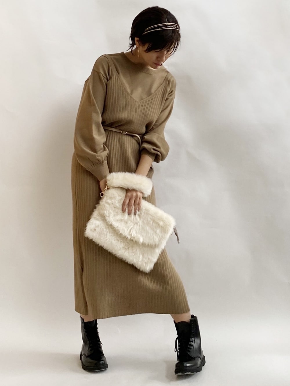 インスタグラマーさんが着てた着こなしが可愛くて真似っこ♡ セットアップのニットワンピ、キャミを上にきてもかわいいー (´,,・ω・,,`) こっちの方が私の体型にはあってるかも! (平胴