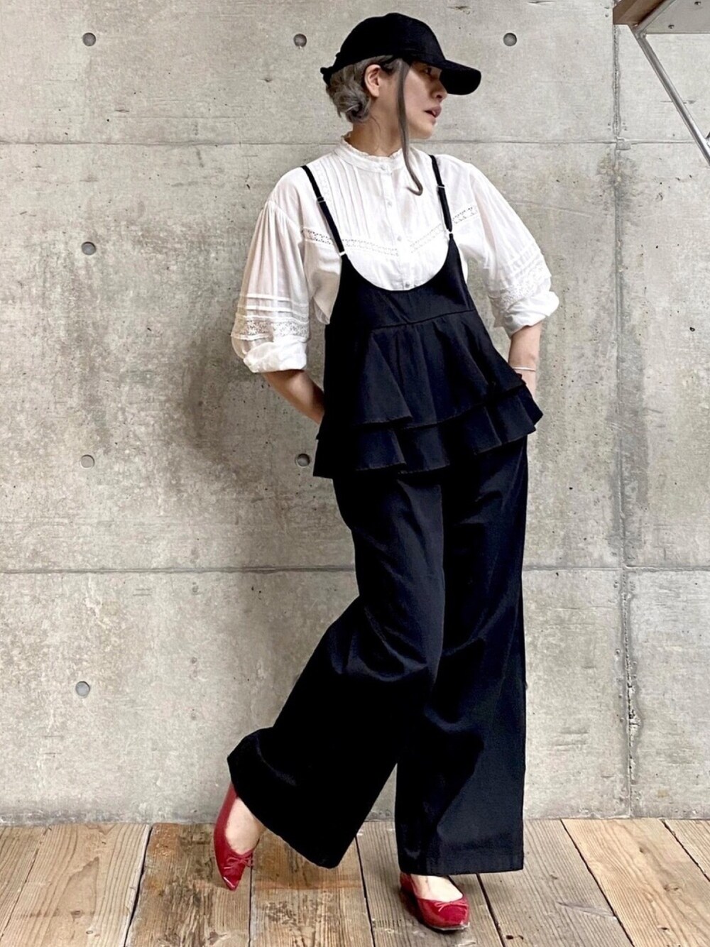 フリルが可愛いサロペット新発売したよー! 前後2WAYなの、お得感はんぱなーい♡ 前フリルにするとガーリー! あえてのモノトーンに差し色で大人キュートなコーデ。