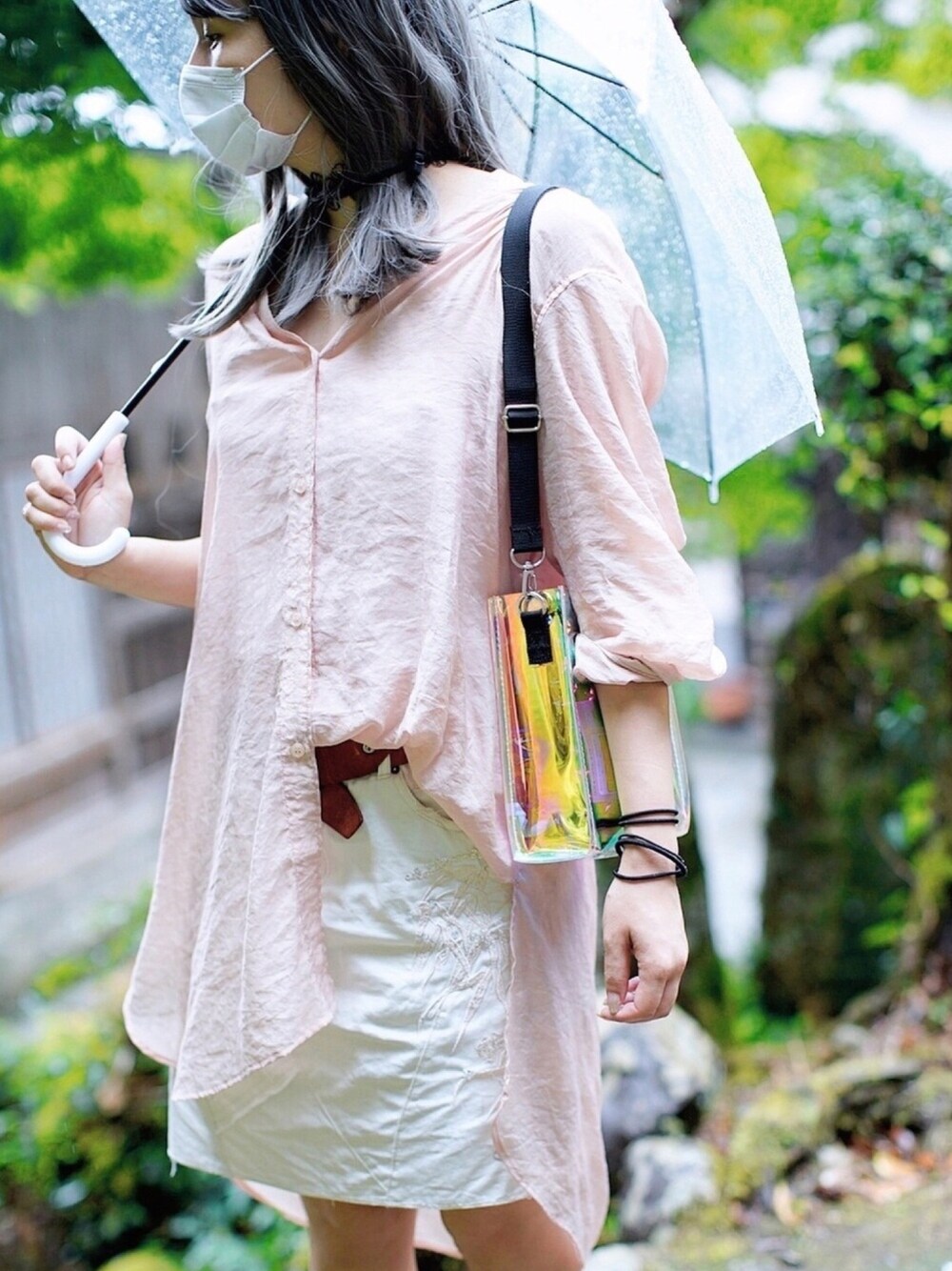 ミサリナのシアーシャツ、可愛いんです♡ バンドカラーが大人っぽいのと 良い感じのニュアンスカラーが良きです! 雨の日に着たけど濡れてもすぐ乾くしこれは梅雨時いいのでは!?