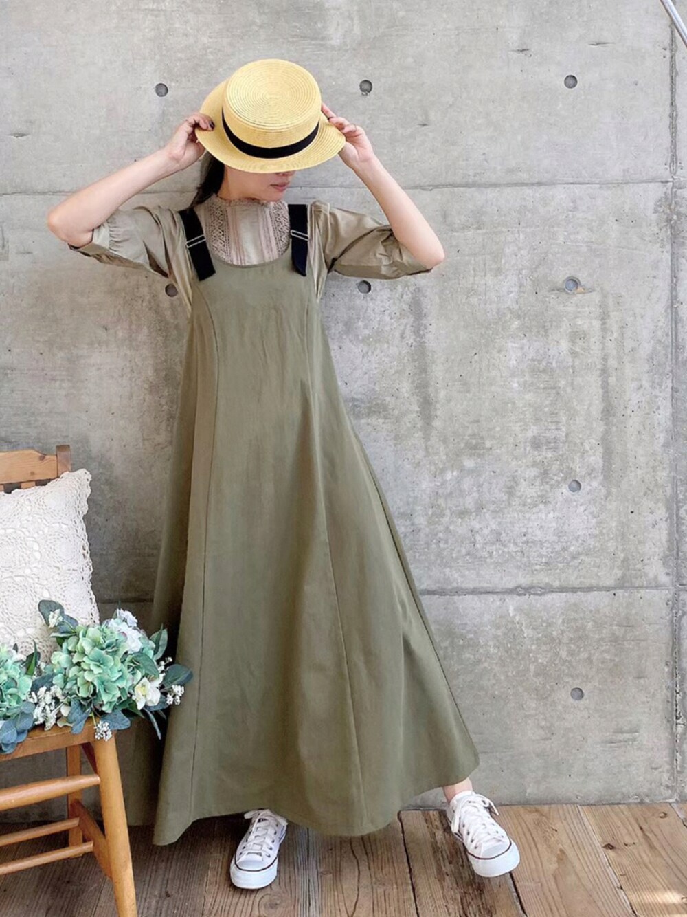 オリーブグリーンコーデ🥰🎶 やっぱり緑かわいー このワンピまだベージュは販売中だよ