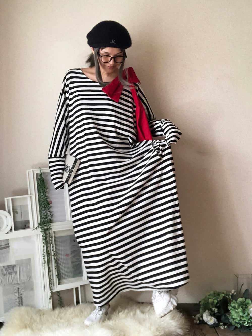 しましま✖️ビビッドレッドすっきー 秋はベレー帽かぶりたくなります♡