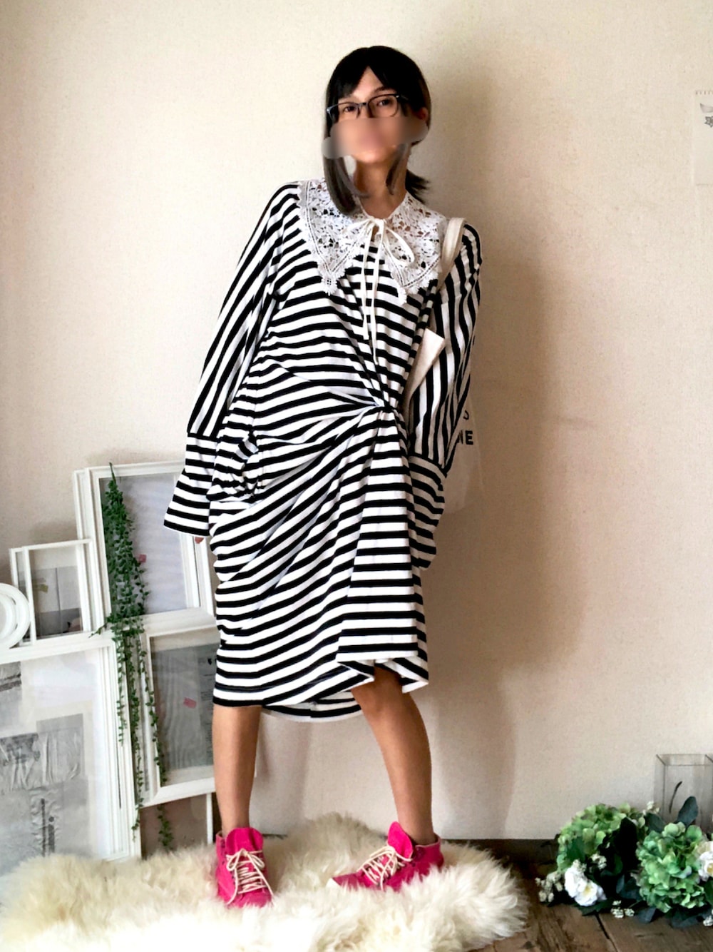 マキシ丈のボーダワンピ、中でちょっと詰まんで固定 膝丈ドレープにアレンジー イメージ固定されやすいワンピも色々着まわせると得した気分🥰