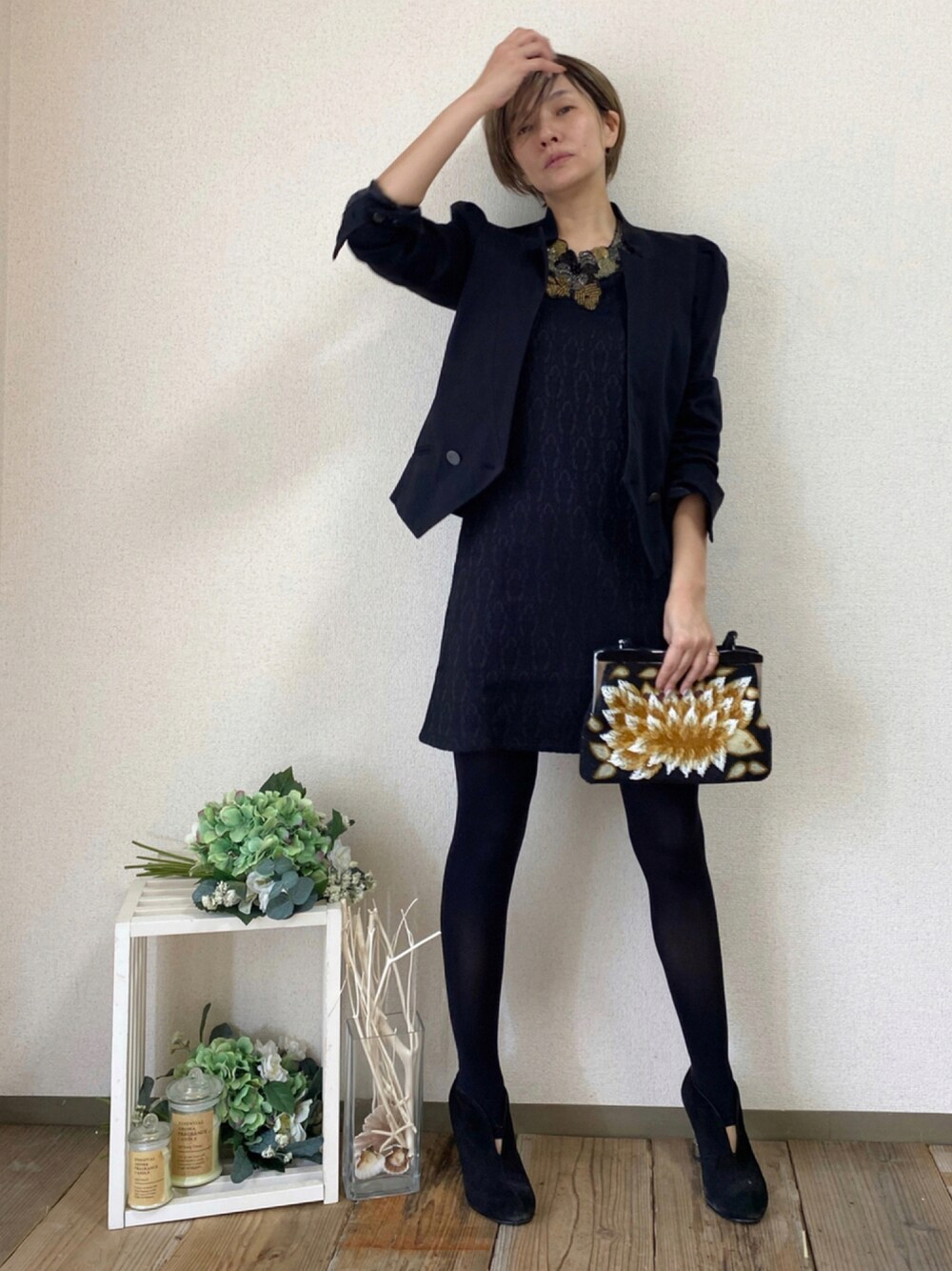 秋のおデートコーデ オールブラックにゴールドアクセントちらりで、 ミニワンピも大人っぽく♡ ビーズバッグはお気に入りのアンティークショップで掘り出しました♪