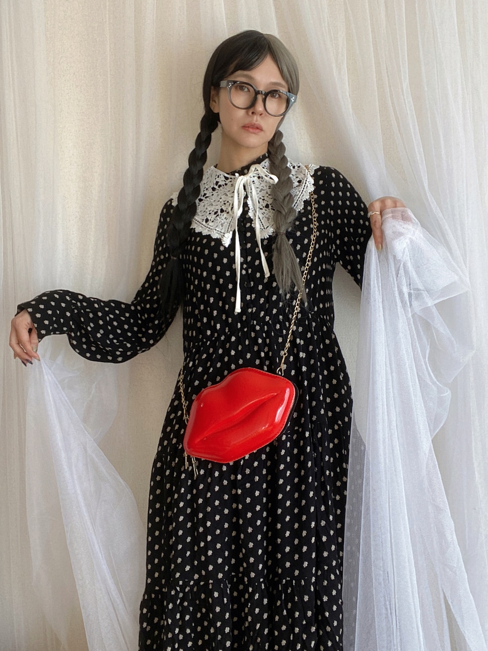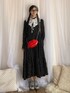 ブラック系のワンピース、レッド系のバッグを着用したレディースの冬コーディネートの3枚目の写真
