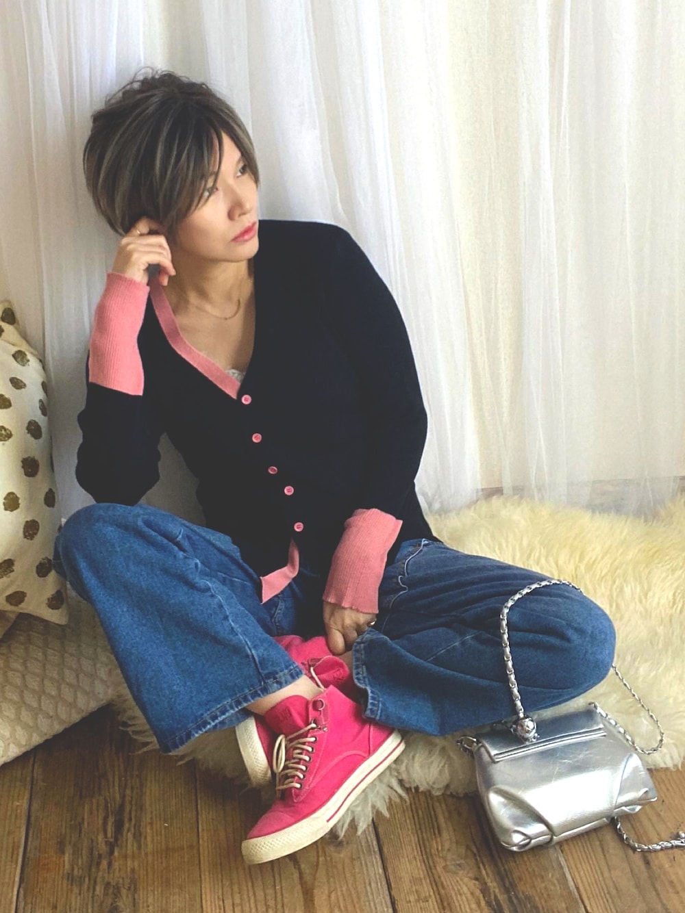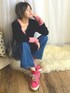 女っぽニットをあえてのボーイッシュに♡ ピンクチラッとおきゃわたん