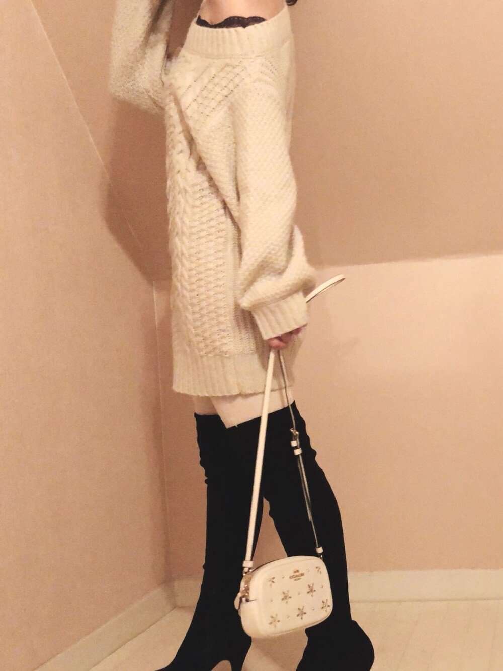 4泊5日の着回しコーデ1日目 寒くないようにGUウォームと同系色のケーブルニットタイツを仕込んで 0肌にならないよう肩出しニットで