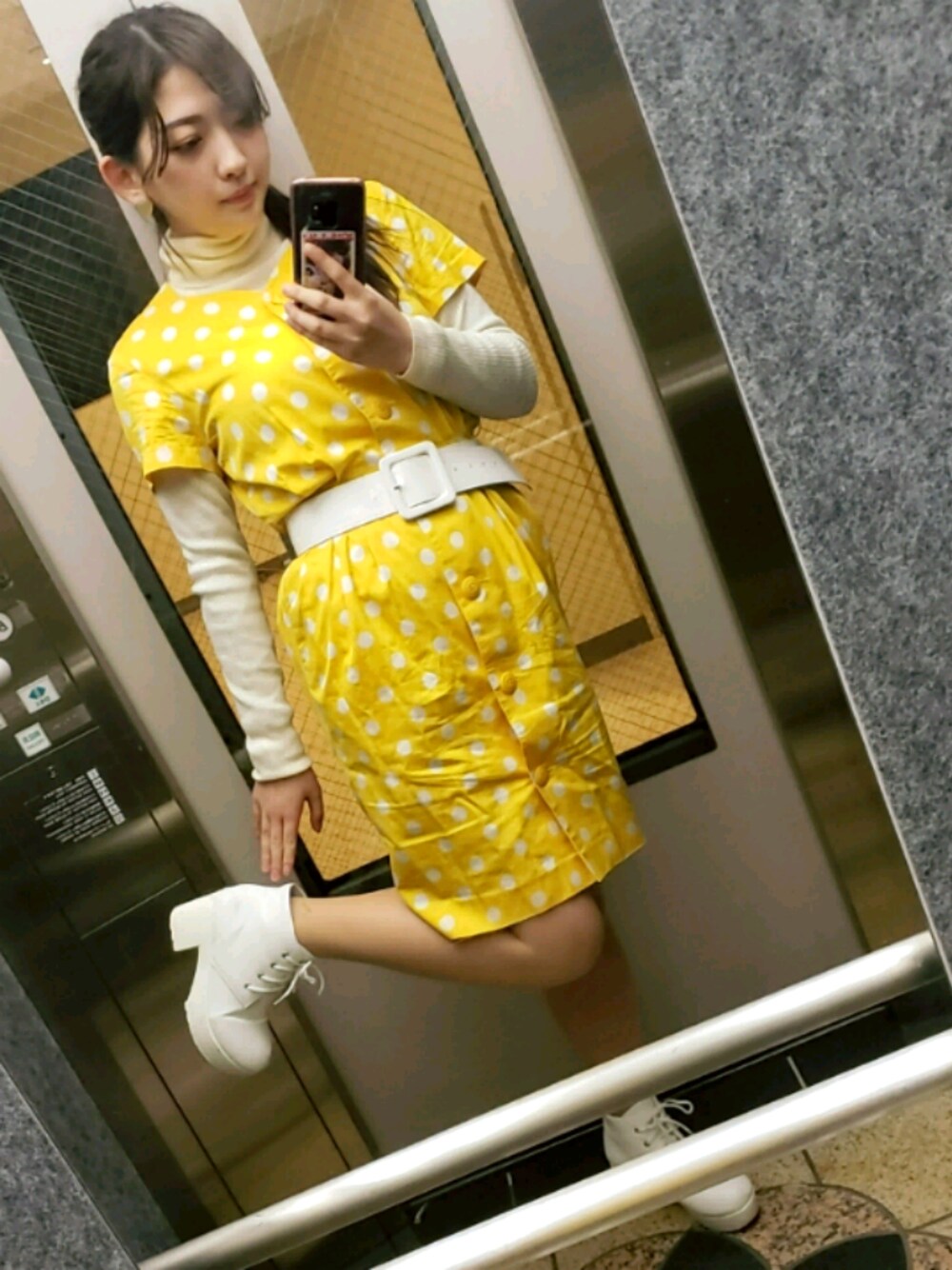 ワンピースは古着です。ペラペラ素材の夏服ですが、下にニットを着ると可愛い。