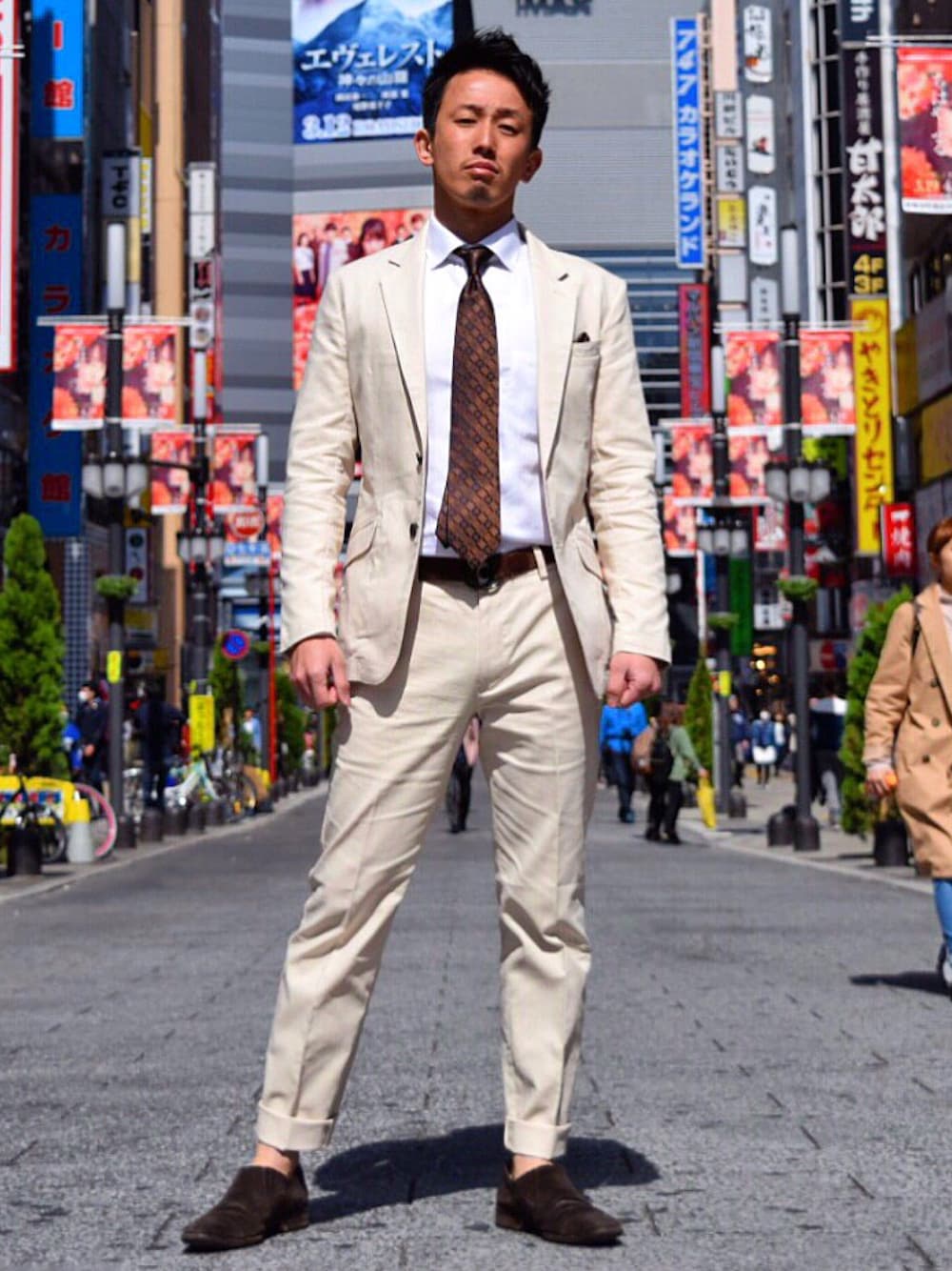 新宿っぽい歌舞伎町のど真ん中で 撮ってみました。笑 ストレッチ性もありカジュアルスタイルビジネススタイルと兼用で使えます^_^ 裾口もMサイズで17.5センチとシャープなのでロールアップも相性が良いです(≧∇≦) ゴルフ焼けが凄い!笑 顔だけ黒い!笑 ベージュの綿セットアップオススメです!