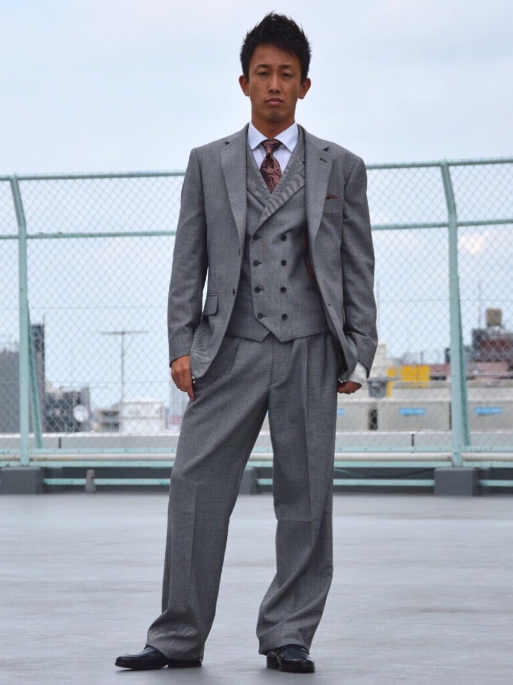 リラックスシルエット スリーピーススーツスタイル スリーピーススーツ ダブルベスト ツータックスラックス ペイズリー柄ネクタイ メッシュ型押しスリッポン