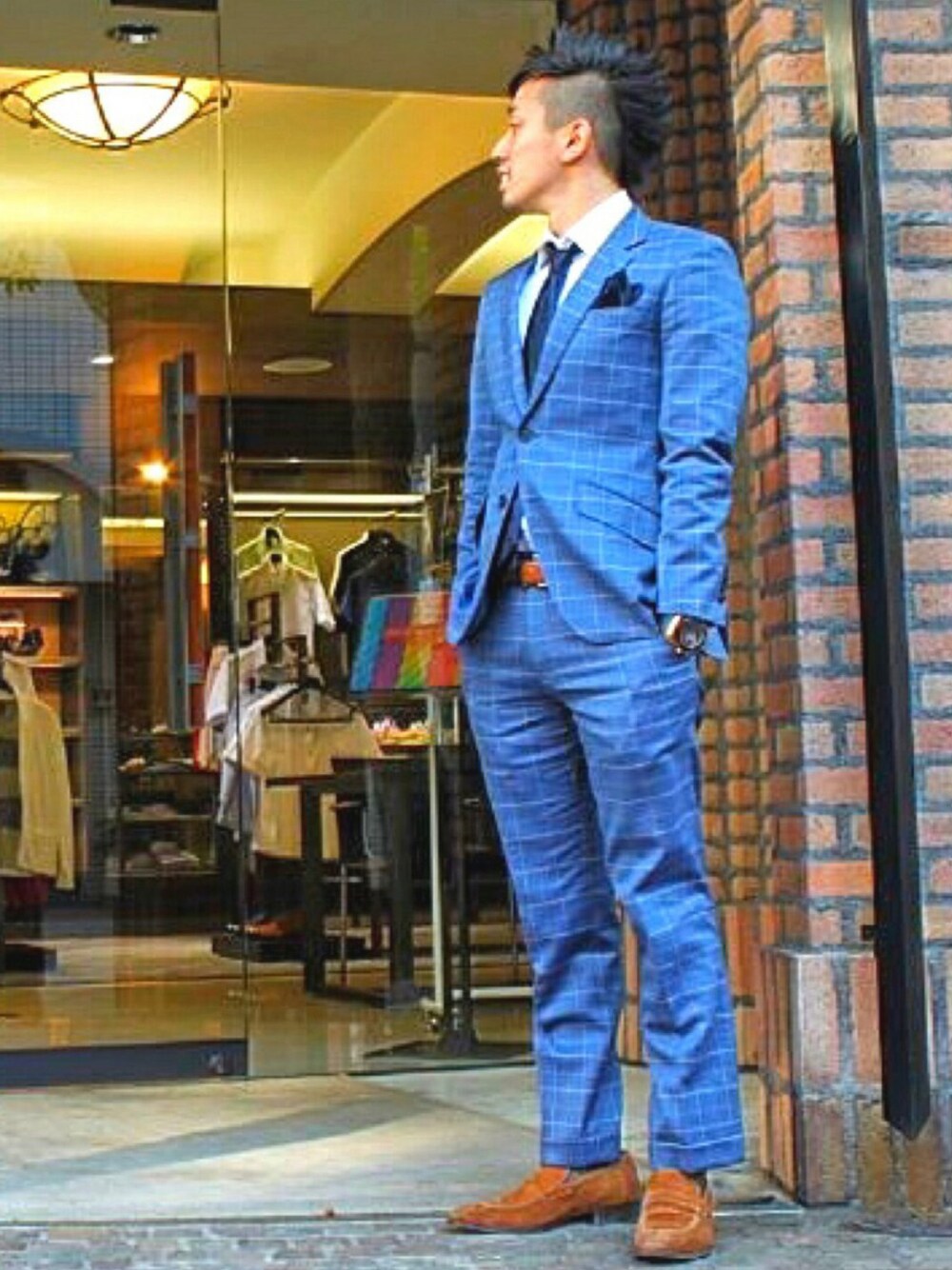 ブルーのチェック柄のスーツに、ネイビーの織りの強いネクタイをコーディネートしました。 ベルトとシューズはベージュで合わせました。 髪型はアシメのモヒカンです。笑 ティノラス本社前にて