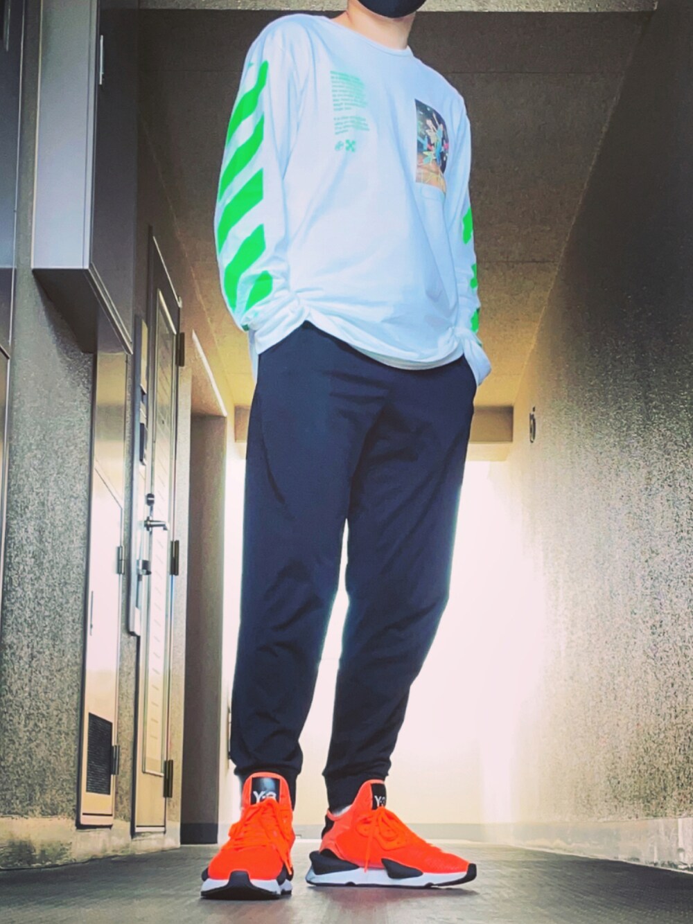 閲覧いただきありがとうございます! off-whiteのTシャツとY-3のスニーカーそれぞれネオンカラーで合わせてみました! どちらも強い色味ですがいい塩梅でコーディネートできたのではないかと思っています〜! 感想、いいね、お気に入りしていただけると嬉しいです!