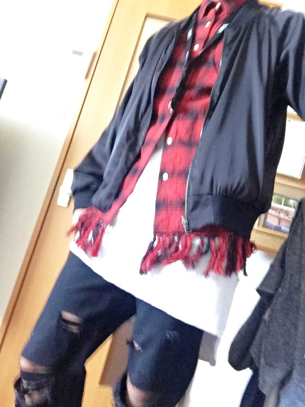 今流行りのロング丈とスカジャンを取り入れました! 自分で作ったダメージパンツでモード感を出したつもりです! 写真ぼやけてます!ごめんなさい!