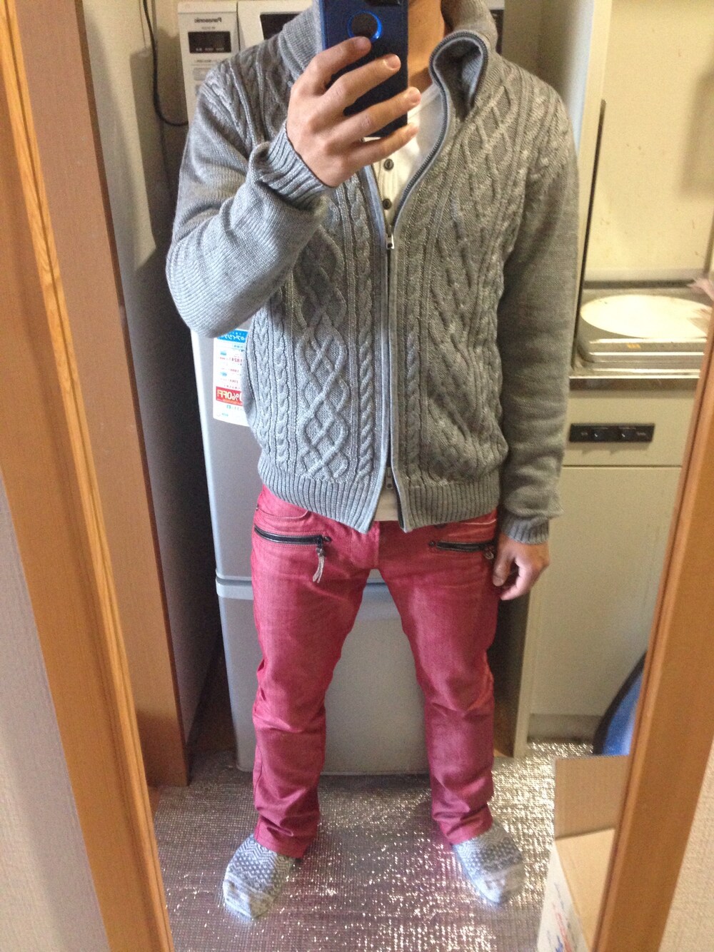 赤だけど赤っぽくない赤パンツ とりあえず無難なグレーで合わせてみました インナーはやっぱ白かなぁ 黒のマフラーとかあるともっとらしくなるのかも