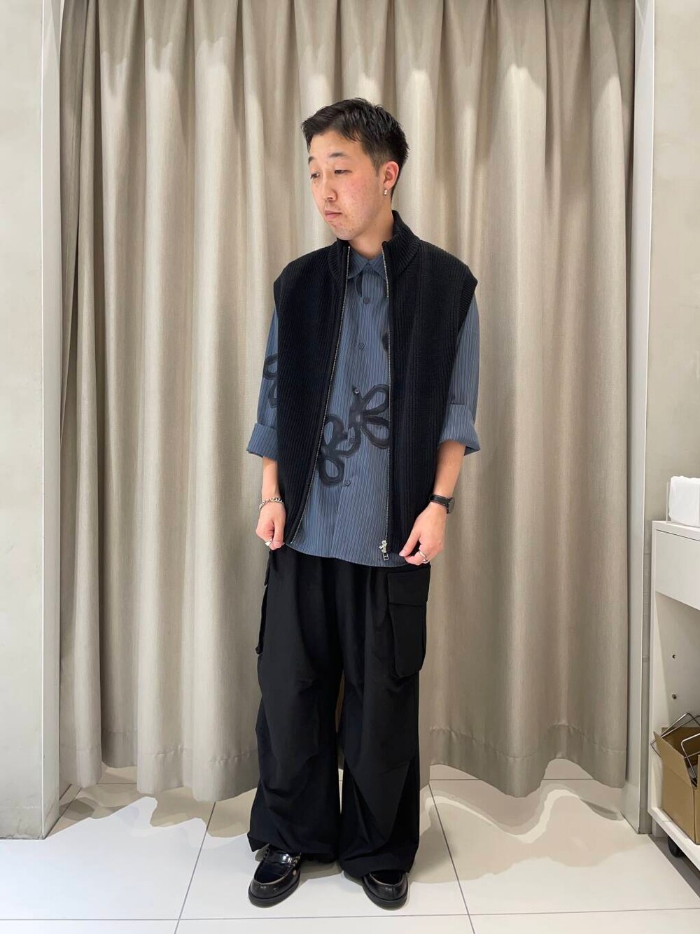 これから着れるシャツコーデ! フラワーストライプシャツをアクセントに ニットベストとワイドカーゴパンツでシンプルに! ベストを脱げば今からでも着れる キレイめカジュアルシャツコーデに!