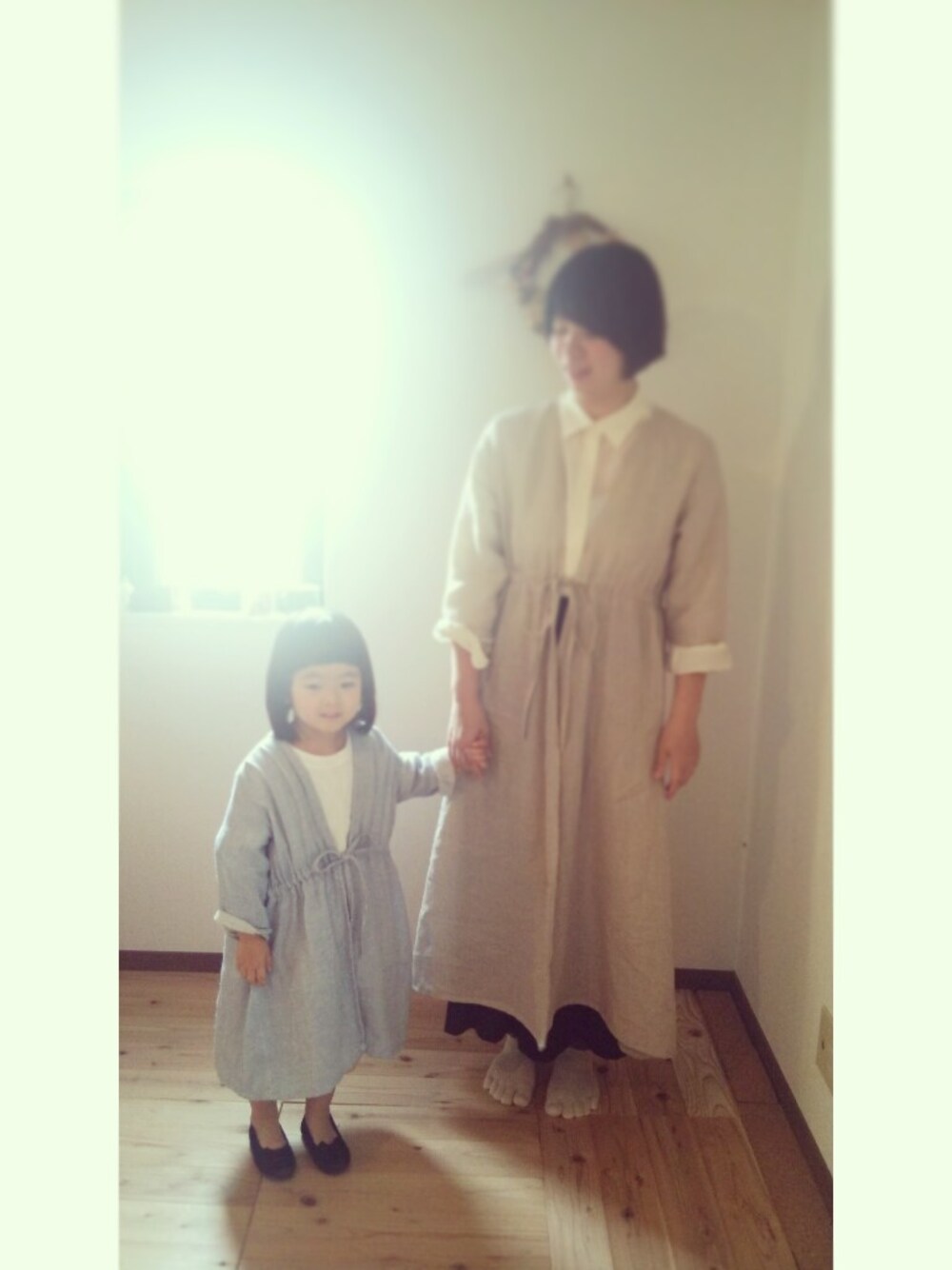 ハンドメイドのリネンタックカーディガンを親子お揃いで作った、ペアルックコーデ◎