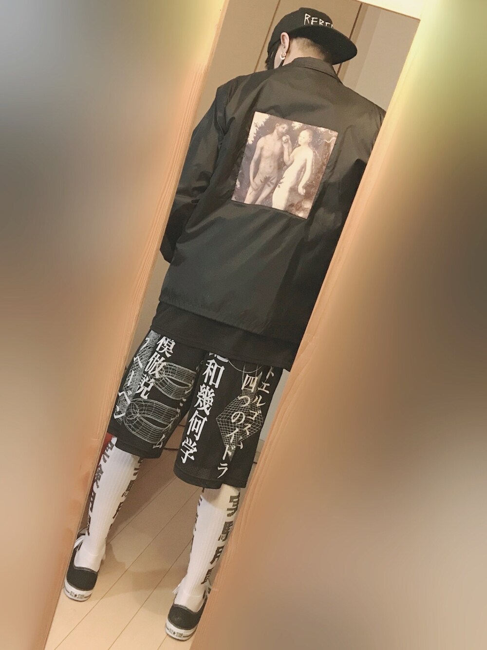 soeの16awのコーチジャケットです! 創世記にあえて幾何学の総柄ショーツに、 漢字ソックスを合わせました。