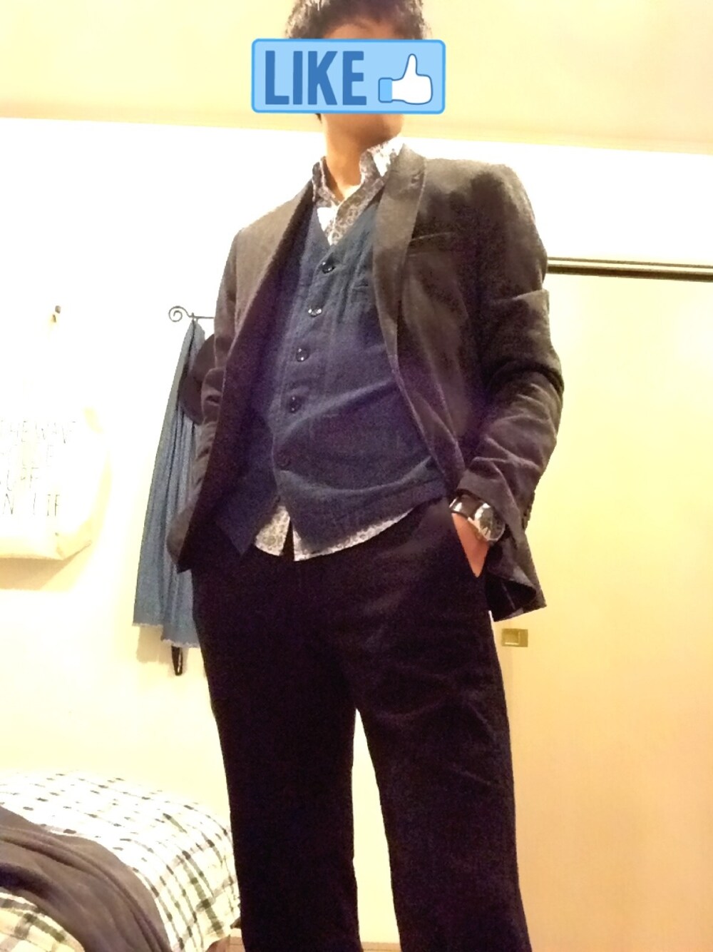 グレー系のテーラードジャケットを着用したメンズの秋コーディネートの1枚目の写真