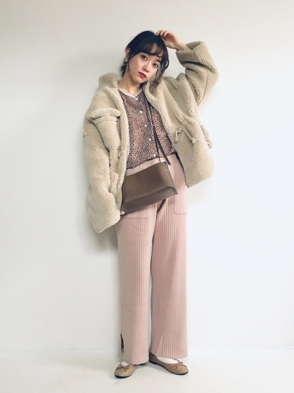 GUのワイドリブニットパンツのピンクが可愛すぎるー!! ブラウスとボアアウターにバレエシューズというガーリーなアイテムで 全体も淡いトーンでまとめました。