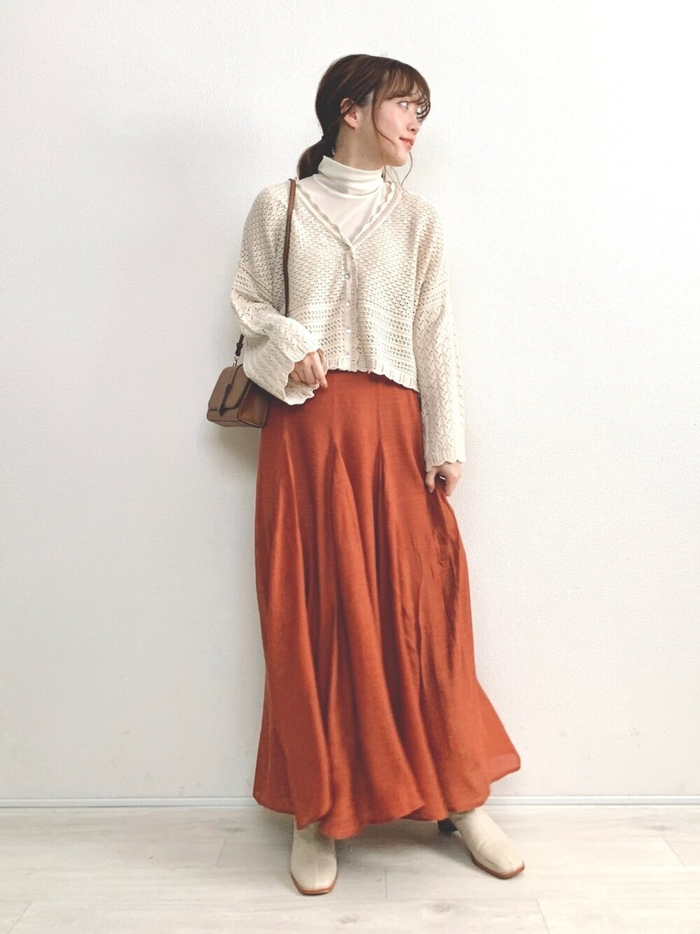 オレンジのフレアスカート。サイズはMです。 ウエストはゴムが入ってるので楽ちん! 生地は薄手ですが裏地あり。 色味も濃い目なので透けは特に気にならない感じです。 シワにはなりやすいので、 届いたらまずアイロンしましょう! てろてろしてて歩くたびに可愛くて テンションあがります♡ カーディガンはGUの新作^_^♡ サイズはMです。 こちらはまた改めてセットアップでもupします〜