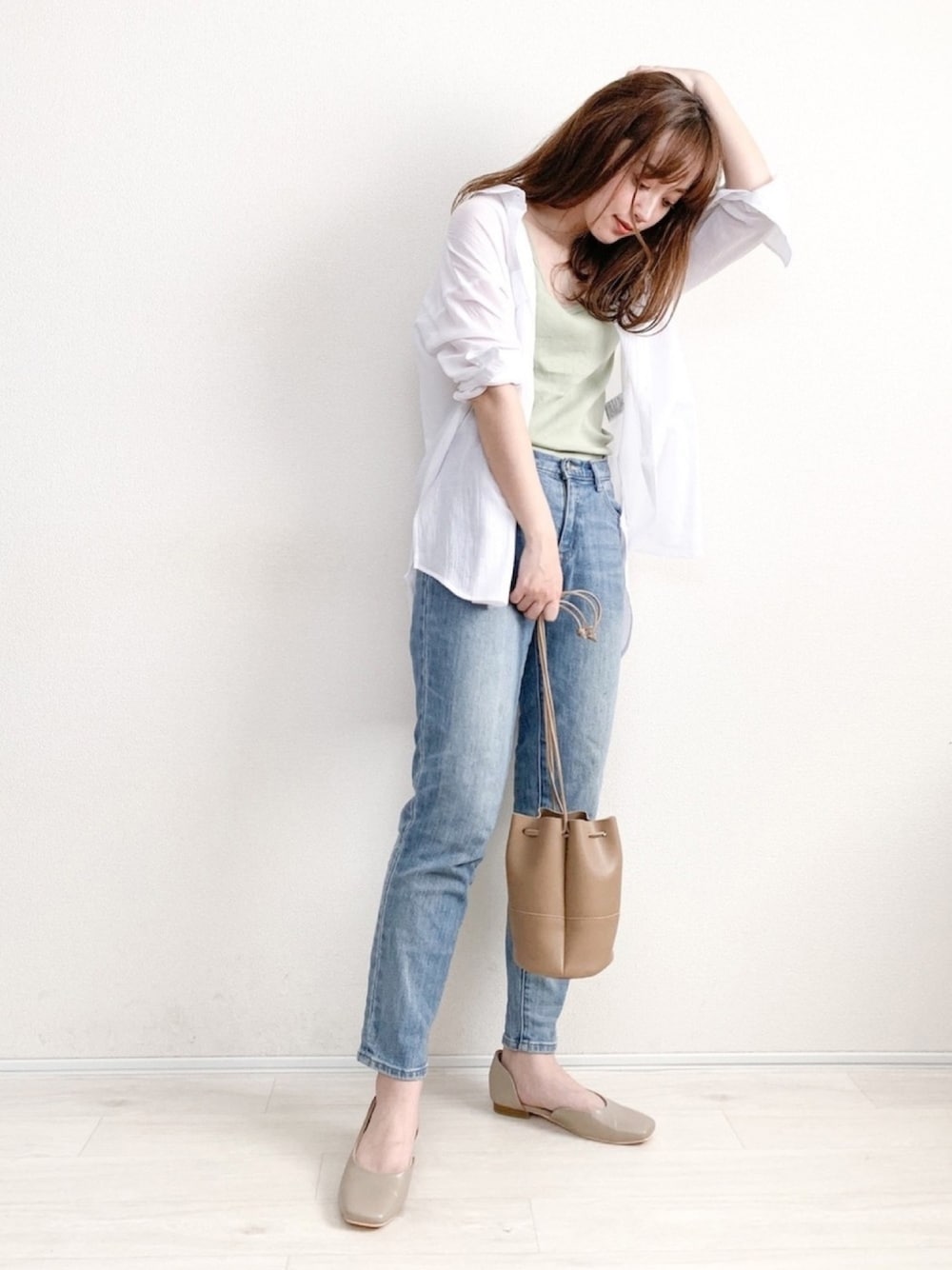 神戸レタスコラボアイテムのシャツ着まわし♡ 淡いブルーのデニムにライトグリーン合わせはイチオシです♡