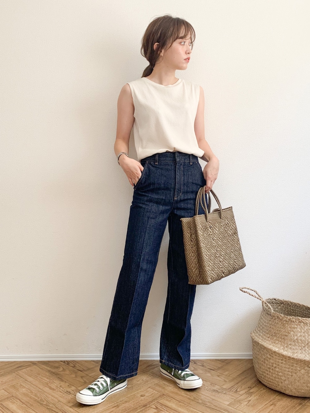 GUのセンタープレスストレートジーンズ! きれいめ好きさんにおすすめです♡ タンクトップはしまむらキャミワンピとセットだったインナーです。