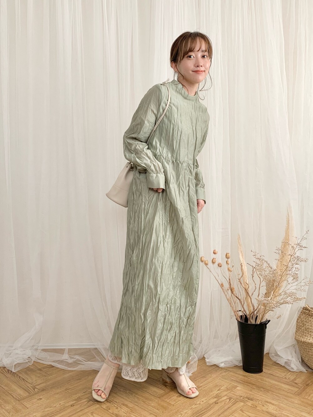 てらのワンピース「ワッシャーロングスリーブワンピース」を使ったコーディネート
