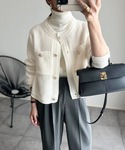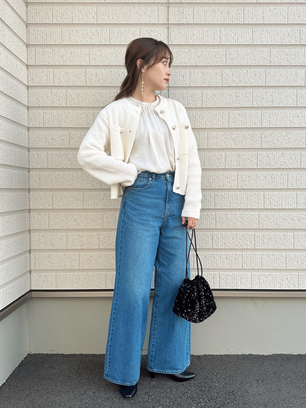 #PR(Ada. terawear emu) コンパクトなカーディガンスタイル🙋♀️ アウターの中にも着込めるサイズ感が◎ ツイード風のカーディガンなら デニムコーデも上品に決まるのがいいね🫡