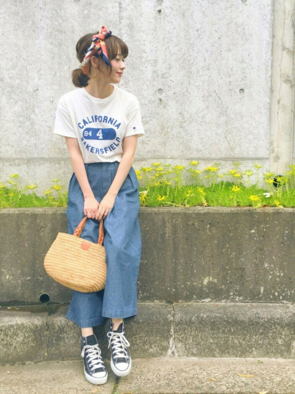 今日は上下KBFです♡ ラフな感じにしたくてロゴTにかごバッグ持ちました。 このワイドパンツ、ハイカットのコンバースとの相性良すぎます😭✨✨ ハイカットでも少し肌チラするから抜け感が出て素敵😭💕 夫と散歩しながら撮影場所を探してます(笑) 夫婦二人三脚でドラフト完走したいと思います(笑)