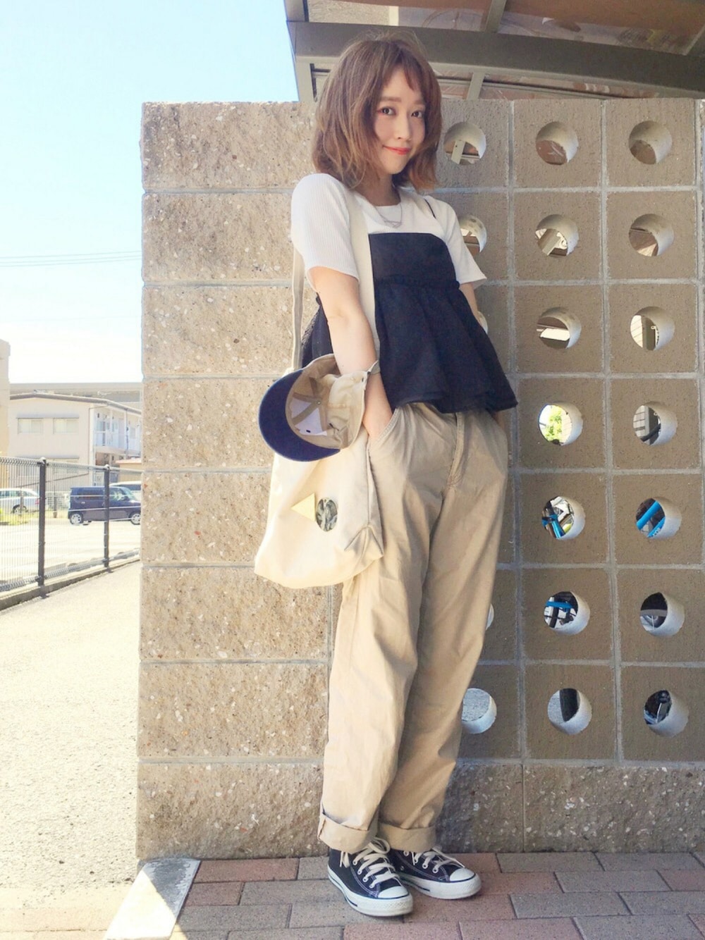 ラフな感じに〜☘☘ 黒キャミにベージュのパンツ。 ヘアは、巻いてるのか寝癖なのか分からないくらい適当〜に巻いて(笑)、ナチュラルな感じに💕 メイクはなんとなく目尻に赤いれました🙆 ベージュのワイドパンツが欲しい、、👀