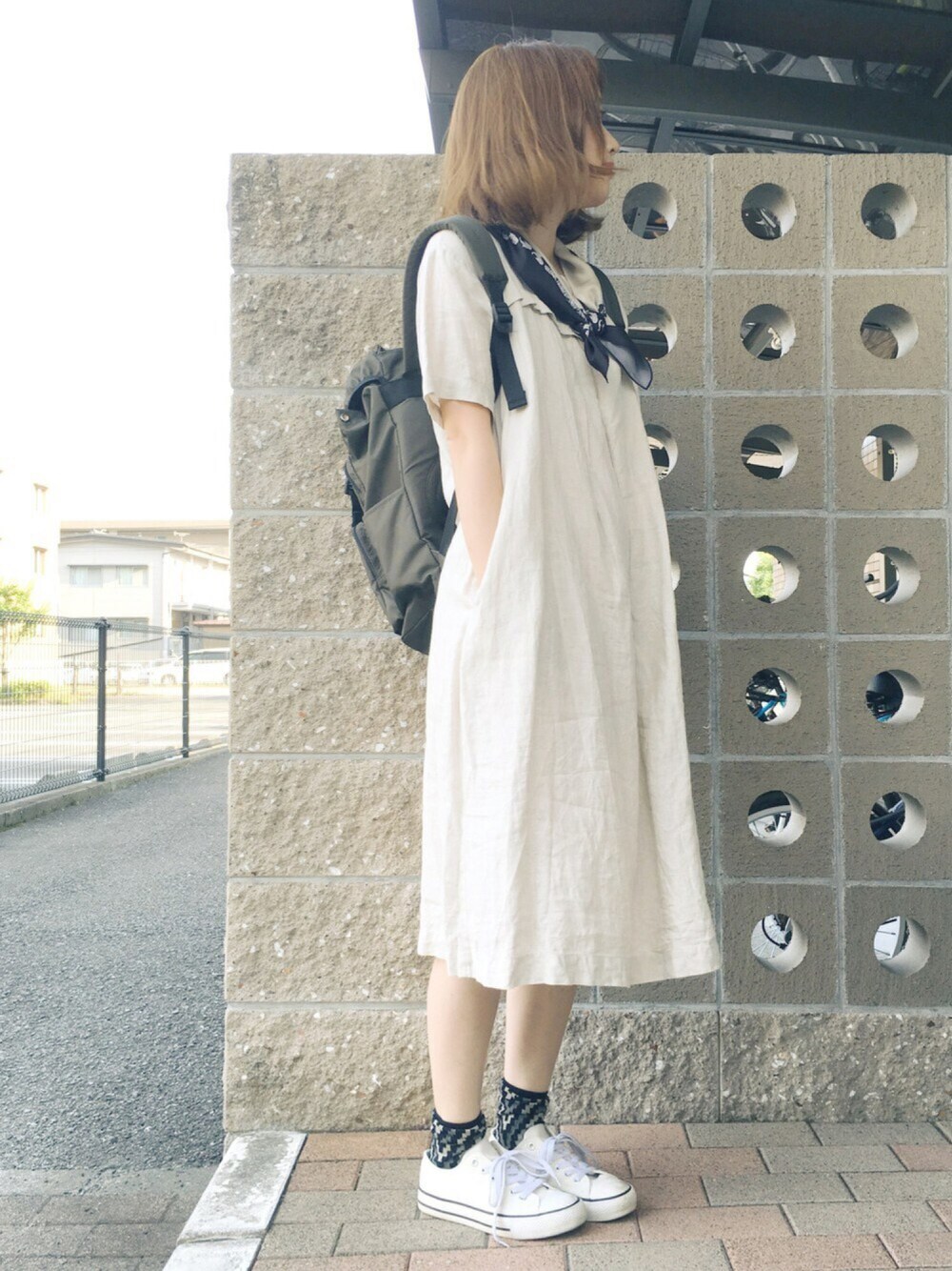 てらのワンピース「リネンクロスクルーネックAラインワンピース」を使ったコーディネート