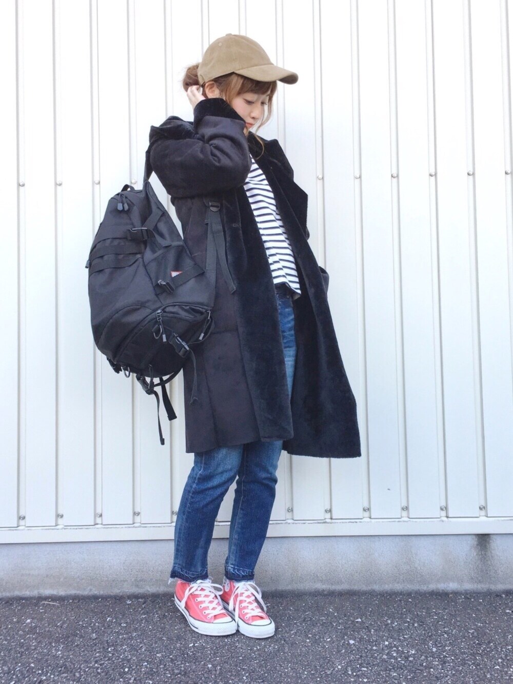 いつもよりボーイッシュ🌼 そういえばボーダー久しぶり👀 コーデュロイのキャップ、濃いめベージュが冬コーデに合わせやすい!! インスタ→terawear