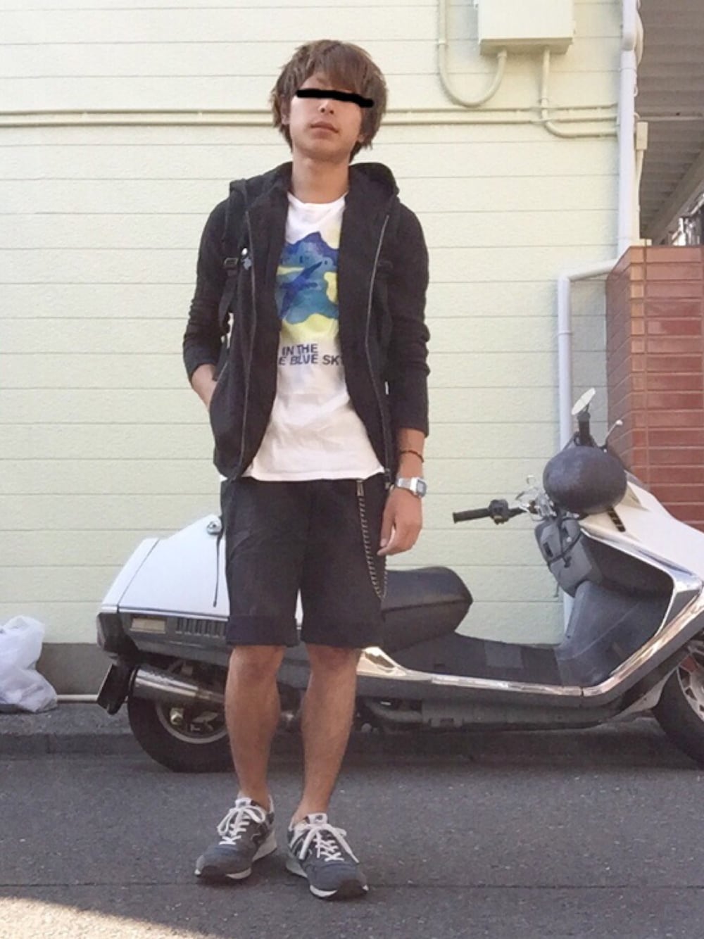 Tシャツ:BLUE BLUE パーカー:JACKROSE ショートパンツ:united arrows スニーカー:574classic 腕時計:CASIO リュック:VANS このTシャツ夏っぽくて好き( ^ω^ )