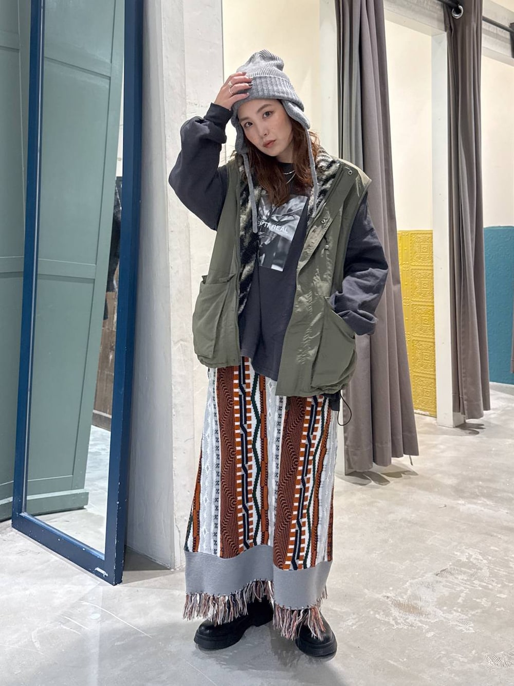 [今日の出勤コーデ!] ▷メンズのリバーシブルベストが 可愛いしあったかいしで買っちゃいました😍 メイクスタッフメンバー企画のニットスカートとの相性◎!! """"""""""""""""""""""""""""""""""""""" ←ここから🌿