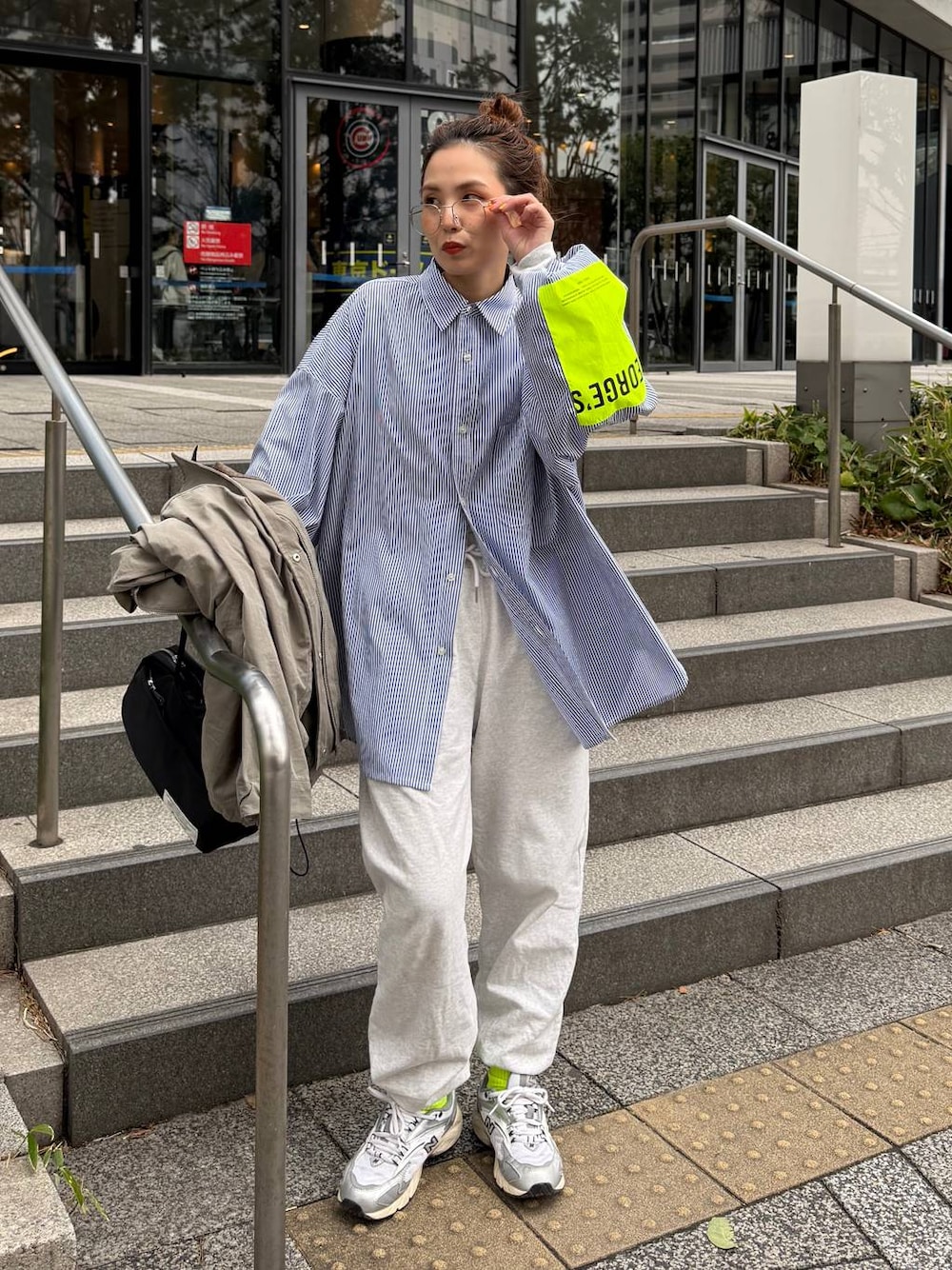 [休日コーデ!] ▷やっぱりスウェットパンツが好きなんだよね🫰🏻 BIGシャツでトラッドMIXスタイルに🫣 今日はこのジャケットが丁度いい気温だったよー! """"""""""""""""""""""""""""""""""""""" ←ここから🌿