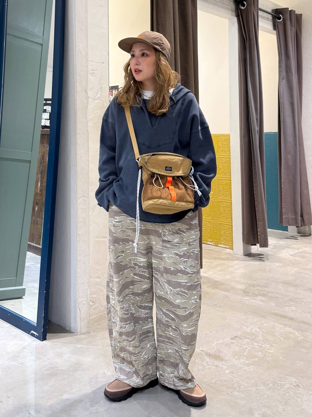 [HAZY CLUB 2/13〜先行予約スタート!] ベージュ×ネイビーで大人可愛く、、! MODE NORM COREのメキパと合わせてみたら可愛かった〜!!!小物はベージュ系でまとめあえて黒を使わないスタイリングに。