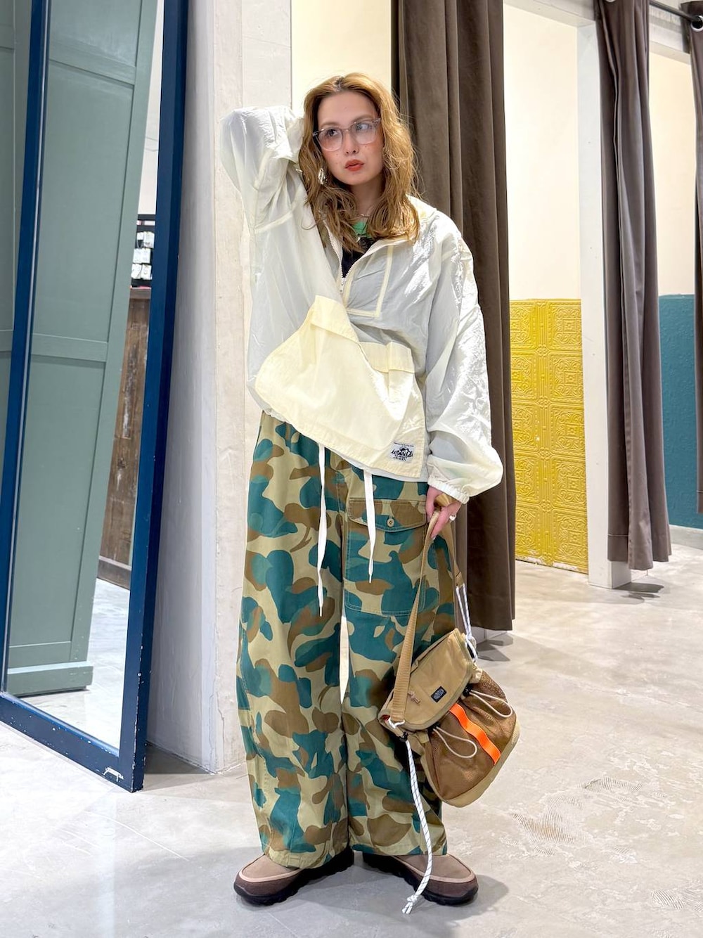 HAZY CLUBアイテムで一味違った春コーデ! カーキカモフラは大柄でインパクト抜群! 夏も着れる生地の厚みなので、Teeにゆるっとあわせたラフコーデもたのしみ!