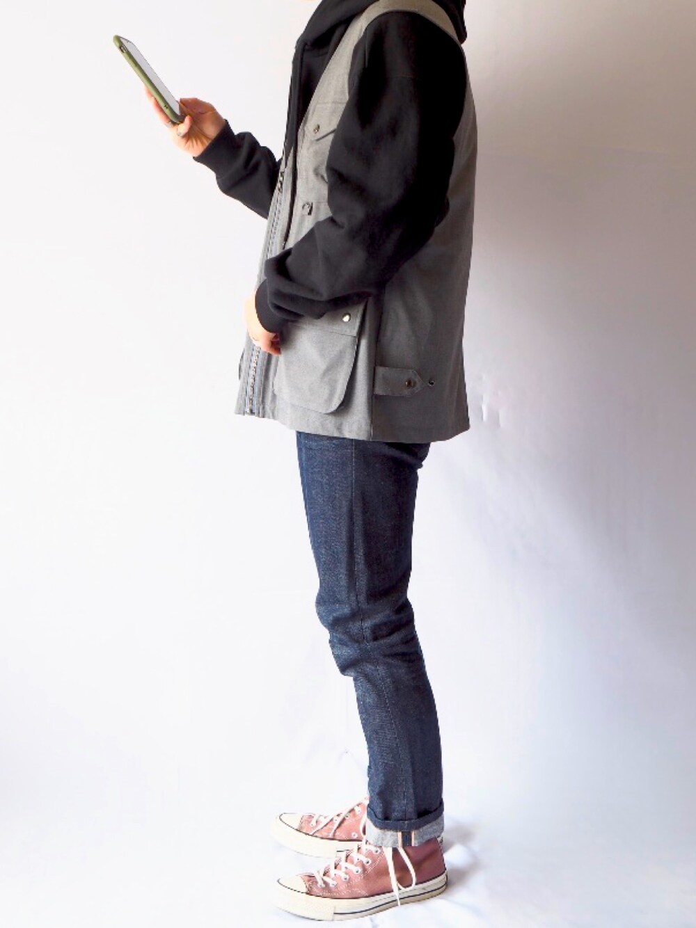 フィッシングベストを使ったレイヤードコーデ A.P.C.のプチニュースタンダードめちゃくちゃシルエット綺麗です。