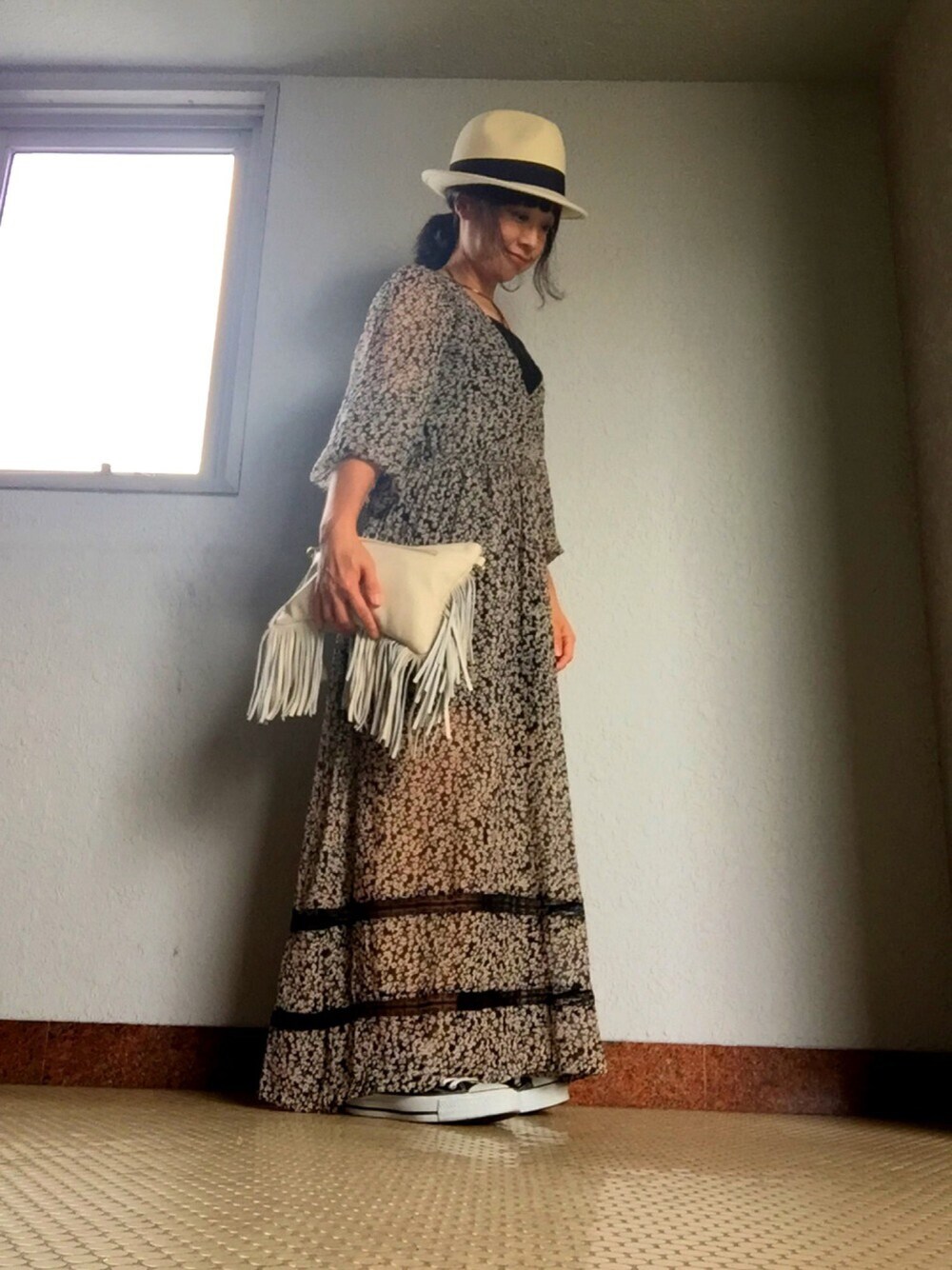 ちょっぴり涼しいので、それなりのコーデです。 背が低いので、ロングワンピは引きずります(笑)