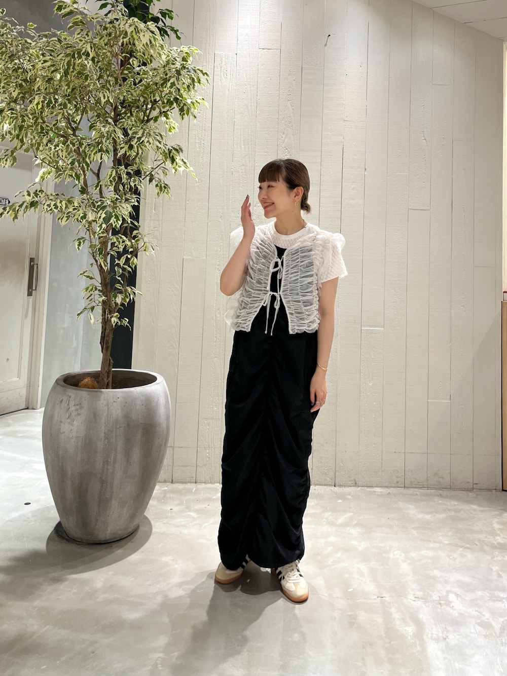 チュールベストを使って キャミワンピースの着こなしにアクセントを! 重ねるだけで同じコーデになりがちな ワンピースのコーデに変化をつけられます◎ ギャザーの効いたキャミワンピースは 1枚でももちろんサマになるアイテム 長さが肩紐で調節出来るので 身長に合わせた着用が出来ます◎