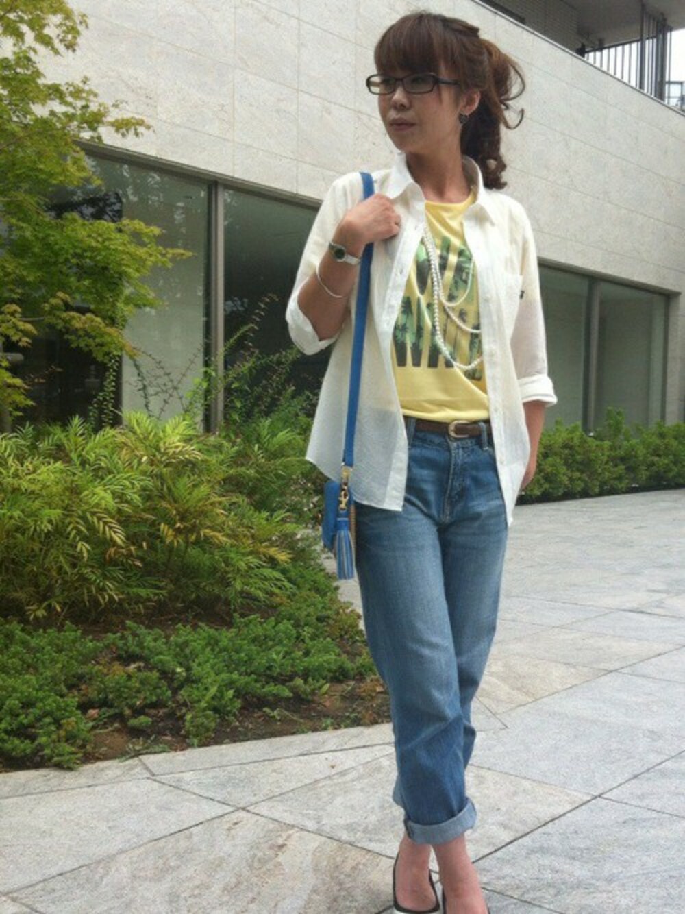 カラフルなプリントTをINして、薄手のシャツをサラッと羽織ってみませんか? アクセやパンプスと合わせれば、子供っぽくならないですよ! シャツIN苦手な方もやりやすいコーディネートですよ。