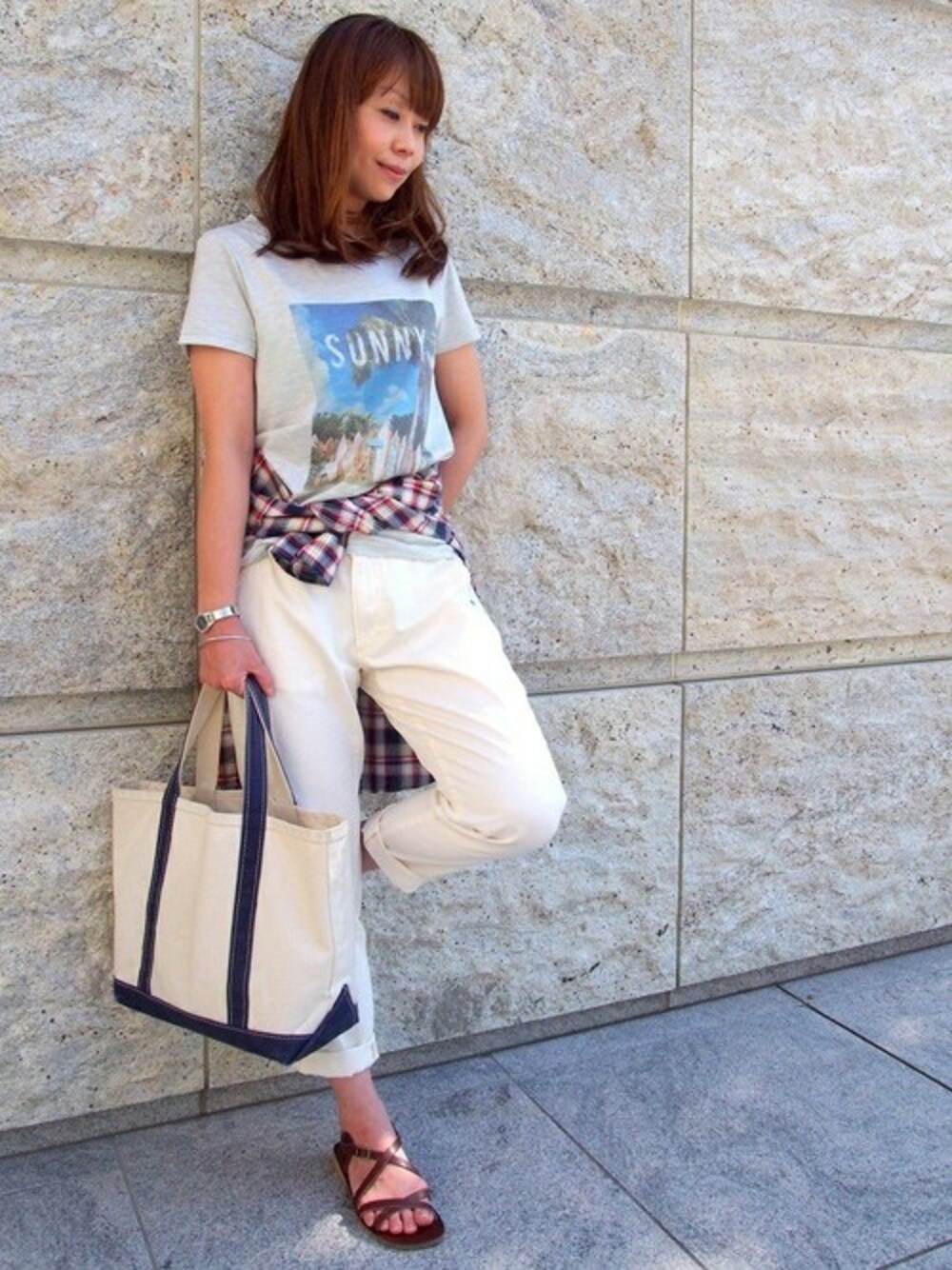 シンプルで今年らしい白ボトムを使った夏コーデにしあげました♪ プリントTは、シルエットが綺麗なので大人カジュアルに仕上げてくれますよ! 海を感じさせるプリントTにキャンバストートは映えますね~!!鉄板アイテムです。 チェックシャツを腰巻きした、動きやすいゆるカジコーデがおすすめです。