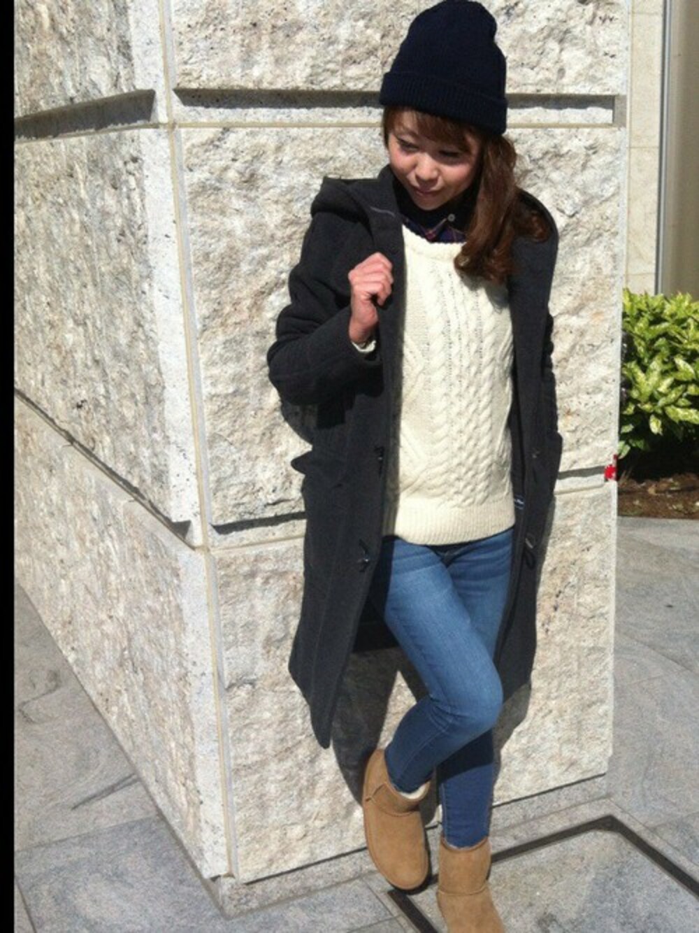 皆様こんにちは♪( ´▽`) ダッフルコート本日グレーをチョイスしてみました。 湘南スタイル風です。 トップスにボリュームがあるので、色味に統一感を持たせつつ、小柄な方でも重たくならないように濃いお色味は避けてみました。 ムートンブーツで足元あったか。小旅行もいいですねー。